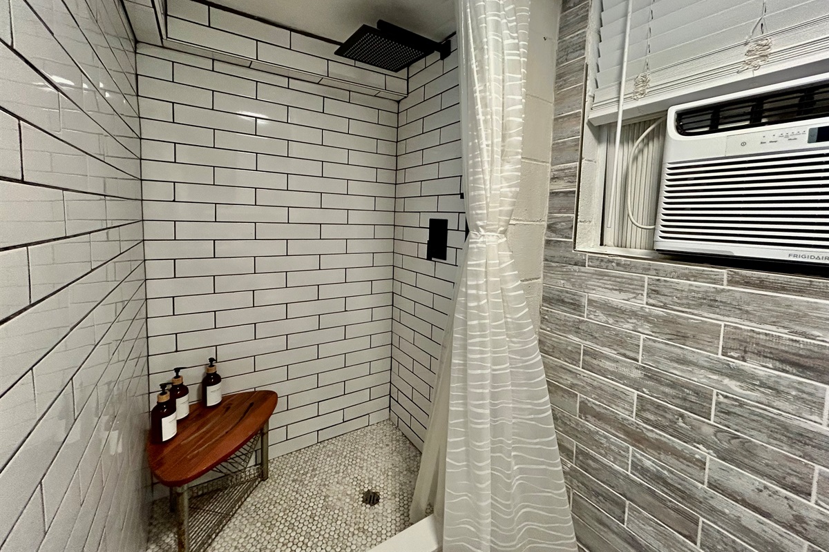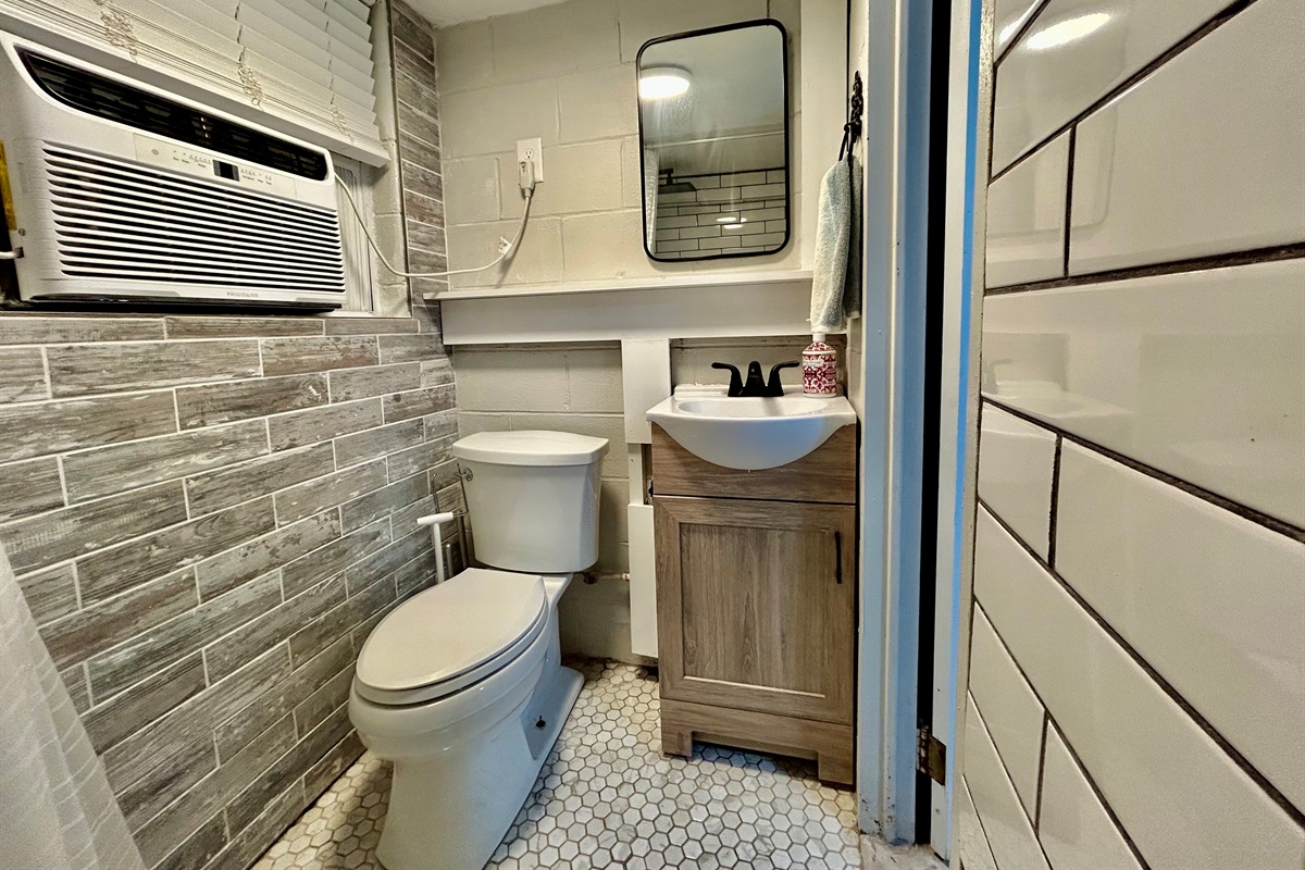 Our lower level can only be accessed from the outside and features two sleeping areas: one with a queen bed and the other with twin beds plus a newly remodeled, full sized bathroom. Note that you must cross through the queen bed area to access the bathroom.