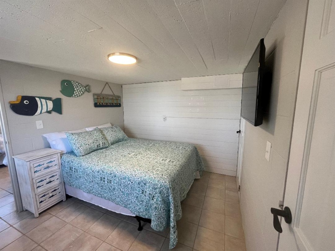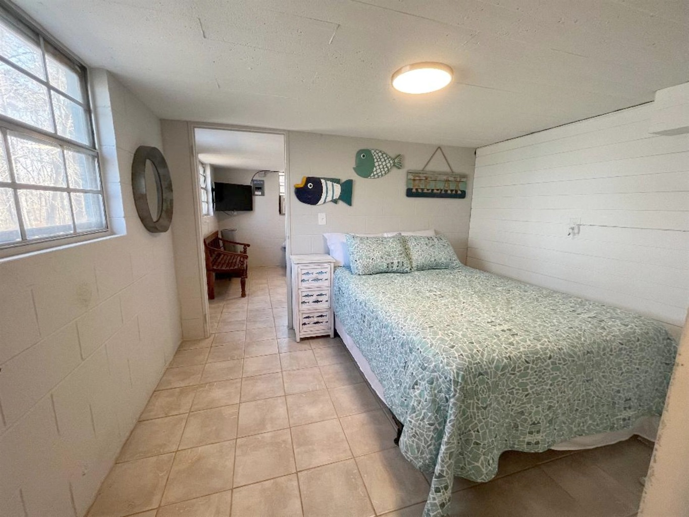 Our lower level can only be accessed from the outside and features two sleeping areas: one with a queen bed and the other with twin beds plus a newly remodeled, full sized bathroom. Note that you must cross through the queen bed area to access the bathroom.
