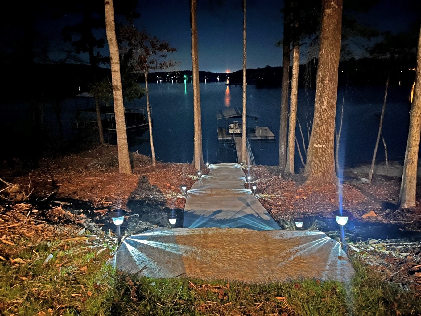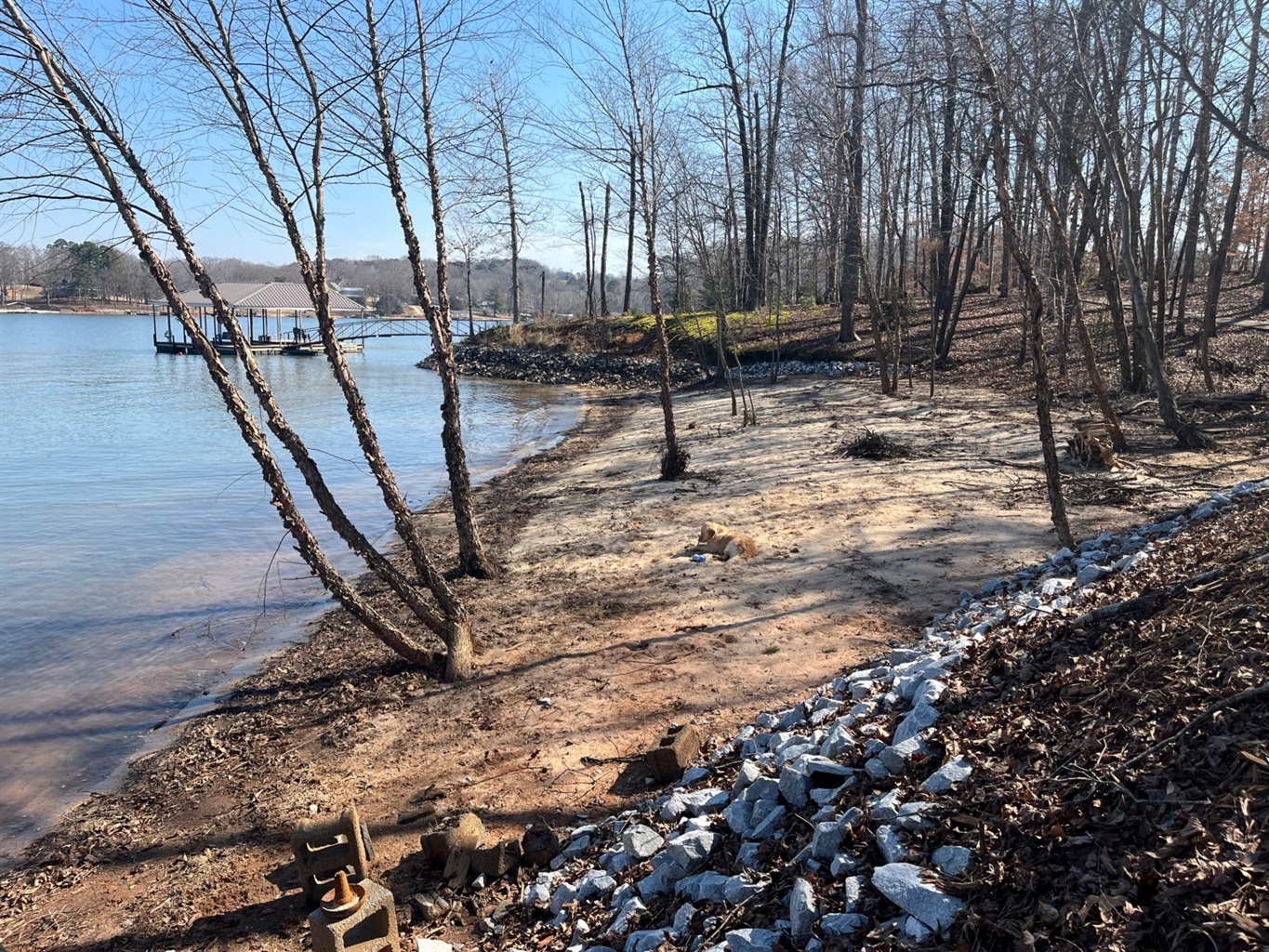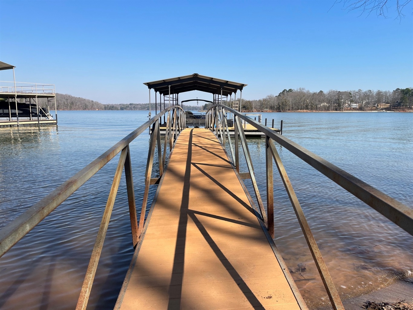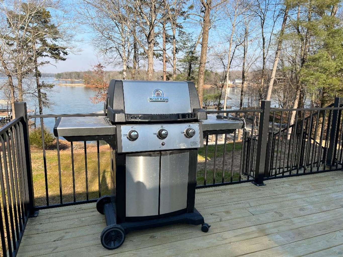 The deck has steps to the ground and the lower level opens to a patio and then to the backyard which slopes gently to the water. A paved, lighted walkway with railing takes you to a beach area (great for beach fires at night), single-slip dock (guest boats or rental boats welcome), a swing, and lounge chairs. We’re in a great deep-water location so the fishing is excellent, and you’ll have fun on the water with our paddleboard.