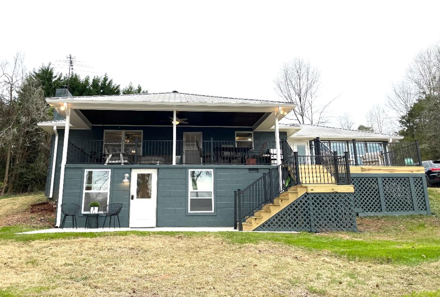 Sitting directly on the shores of Lake Hartwell, Greens Cay is a completely remodeled and updated 4 bedroom, 2.5 bathroom ranch home with finished basement. Inside on the main floor, there are two living areas each with smart TV and a sleeper sofa. A full kitchen, washer and dryer, ½ bath, and even a warm-water dog rinse and fireplace round out the inside amenities. Also on the main floor are two bedrooms, each with queen beds, smart TVs, and a full bathroom between them.