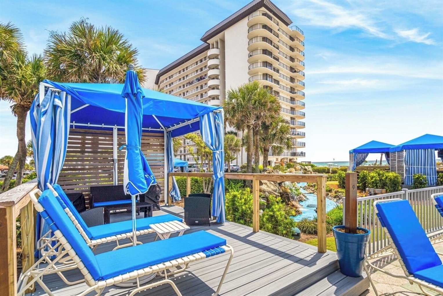 There is no place in Panama City Beach that rivals Edgewater Beach and Golf Resort, offering more amenities than any other area resort: enjoy the seasonally-heated pool, hot tub, and sundeck directly in front of Tower 3 (the only things separating you from the beach and the water) or step a few paces to the right and dip into the beachfront lagoon pool that is 11,500 square feet and surrounded by lush tropical foliage and waterfalls. There are plenty of pool loungers for relaxing by the pool or you can rent a set of VIP Lounge Chairs/Umbrella or a poolside Cabana with luxury amenities. The free kids splash pad and two additional hot tubs flank the lagoon pool, and for meals/snacks/drinks, stop into Oceans Restaurant or pop by Blenders or Shakers bar.