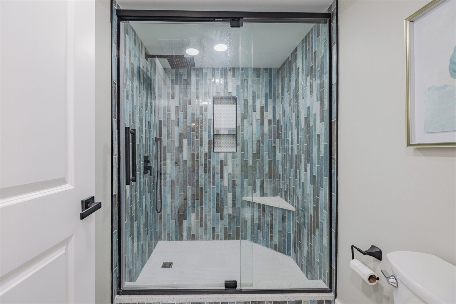 The master bedroom features a king-size bed, smart TV with streaming channels, ceiling fan, clothing storage, and an ensuite bathroom with a tiled walk-in shower.