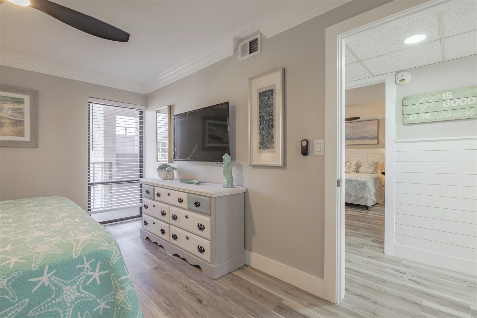 The guest bedroom features a king-size bed, smart TV with streaming channels, ceiling fan, clothing storage, and access to the 2nd full bathroom with a tub/shower combo.